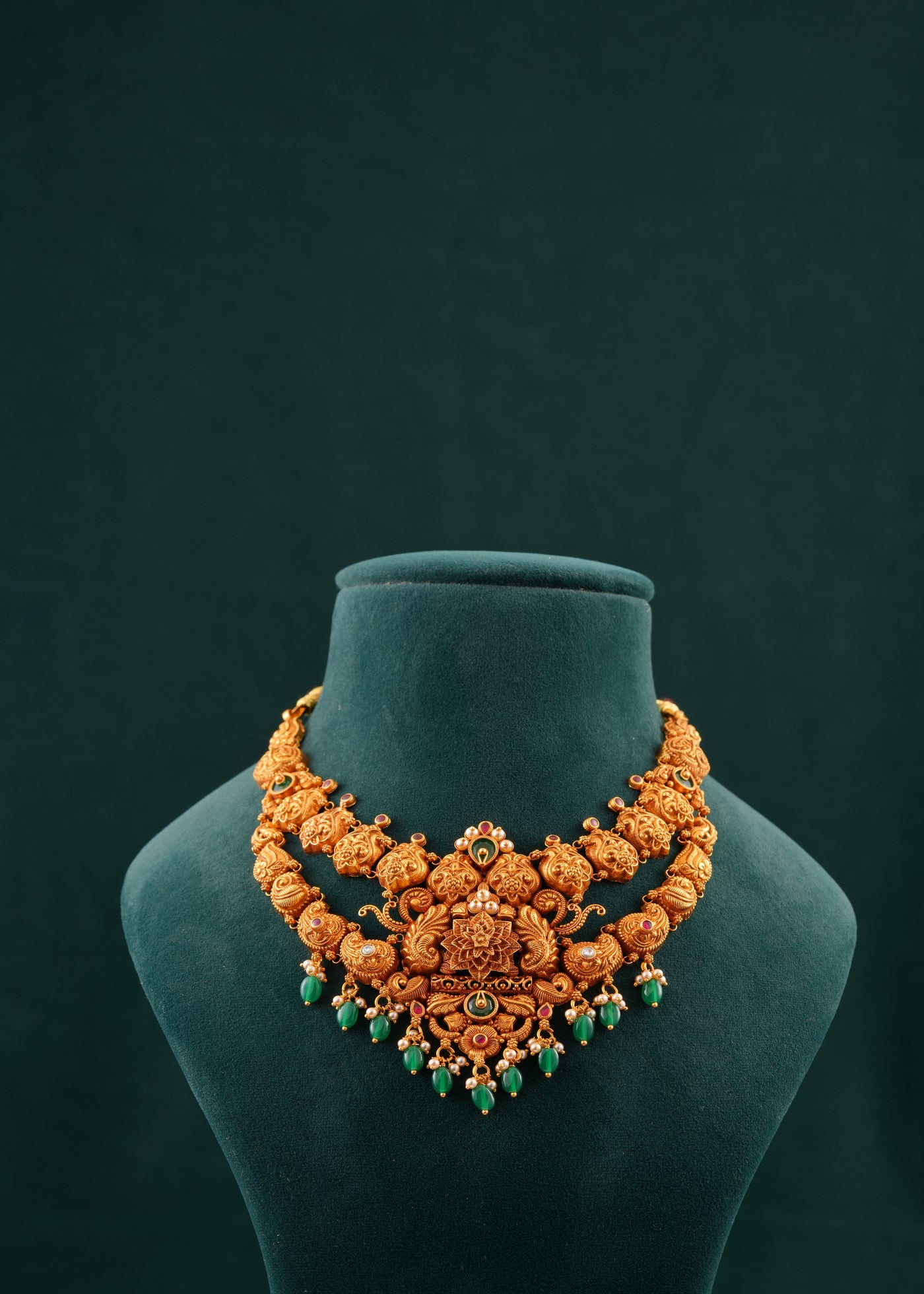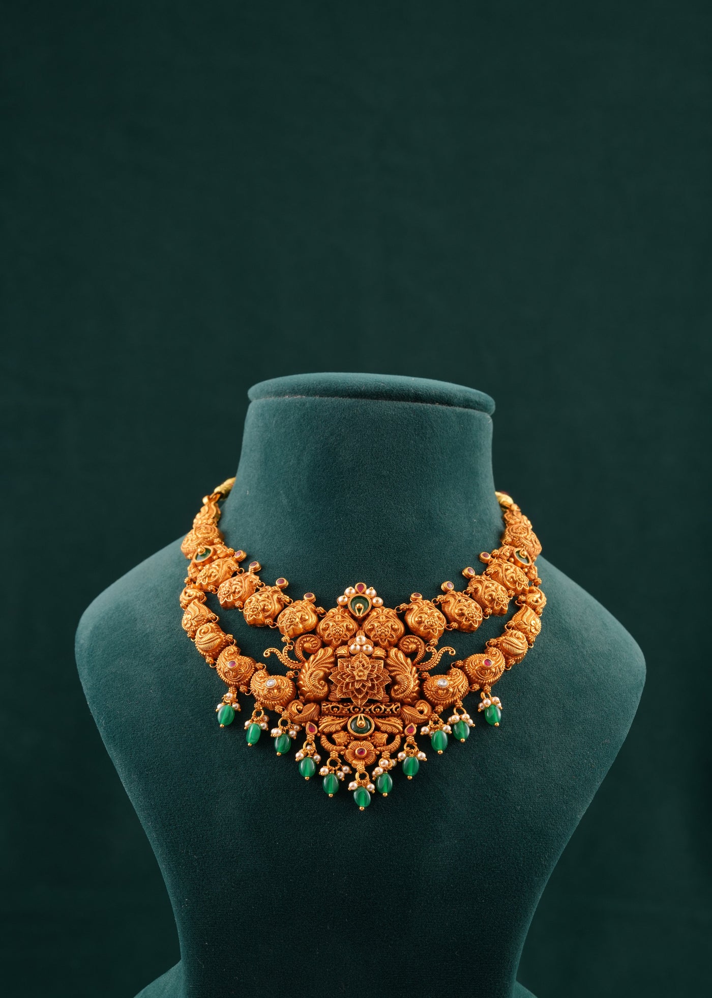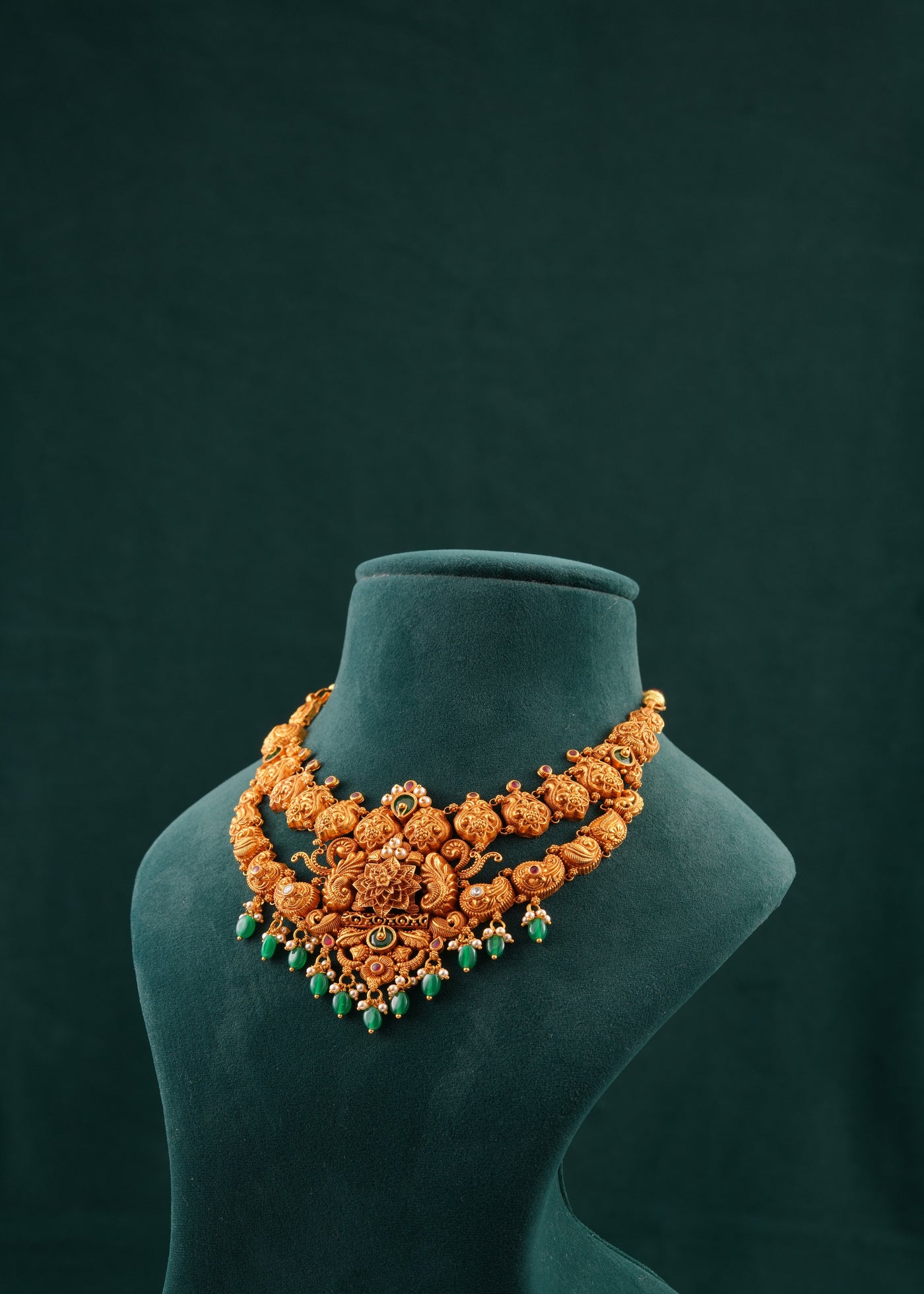 Crafted with intricate Nakshi artistry, this short Haram exemplifies traditional craftsmanship fused with refined elegance. Its detailed patterns enhance any attire with a touch of cultural richness, making it a versatile accessory for both festive occasions and daily wear. Designed for comfort and style, it complements various necklines while celebrating heritage through sophisticated design.