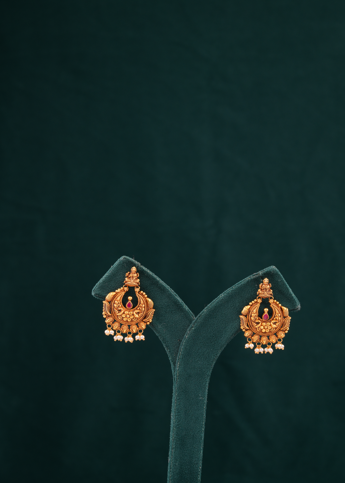 These 22KT Chandbali earrings showcase exquisite craftsmanship in high-purity gold, reflecting timeless elegance. Their crescent shape is inspired by traditional designs, making them a perfect accessory for festive occasions and weddings. Lightweight yet durable, they offer comfortable wear while enhancing your ethnic wardrobe with classic charm and sophistication.