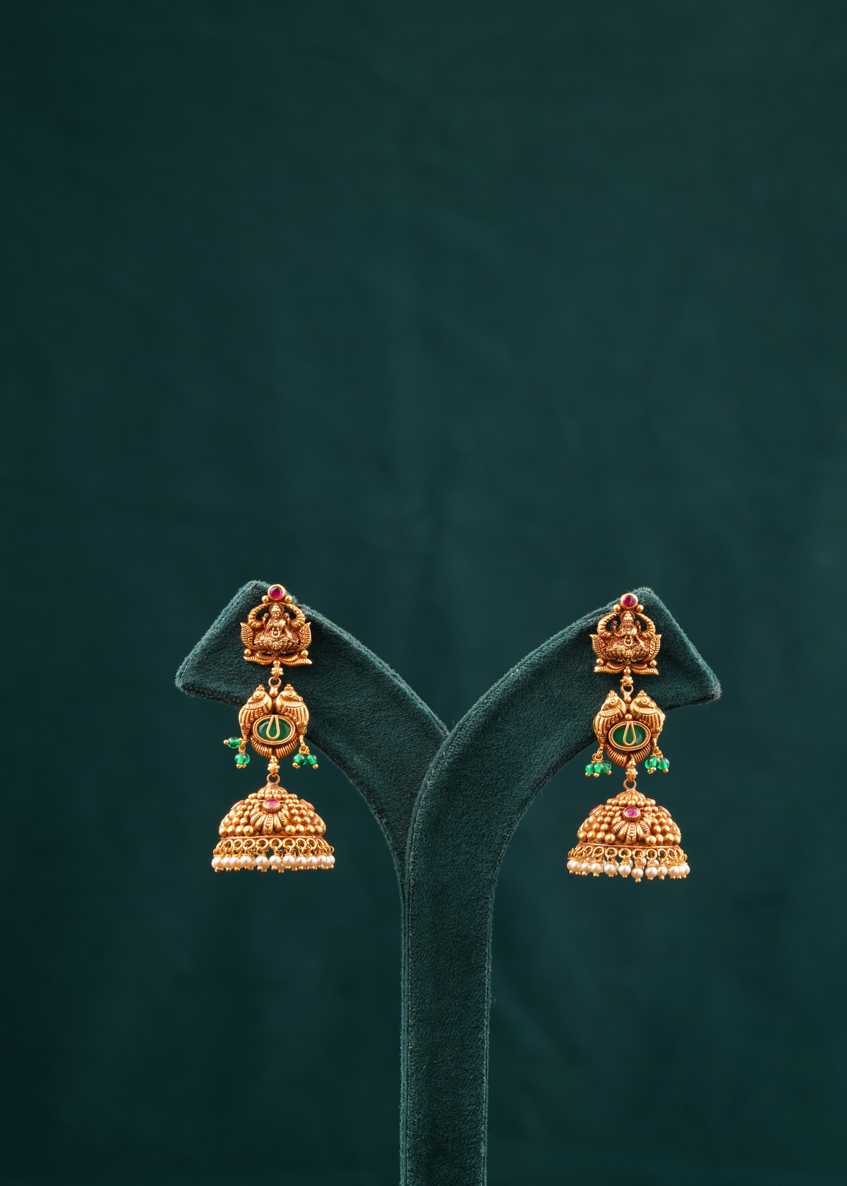 Crafted from 22-karat gold, this Lakshmi Devi Kammalu beautifully blends traditional craftsmanship with spiritual significance. The intricate design honors the goddess Lakshmi, symbolizing prosperity and auspiciousness. Perfect for those seeking a meaningful and elegant piece, it offers both cultural richness and timeless appeal.