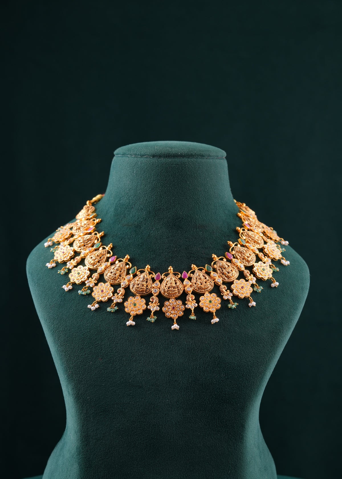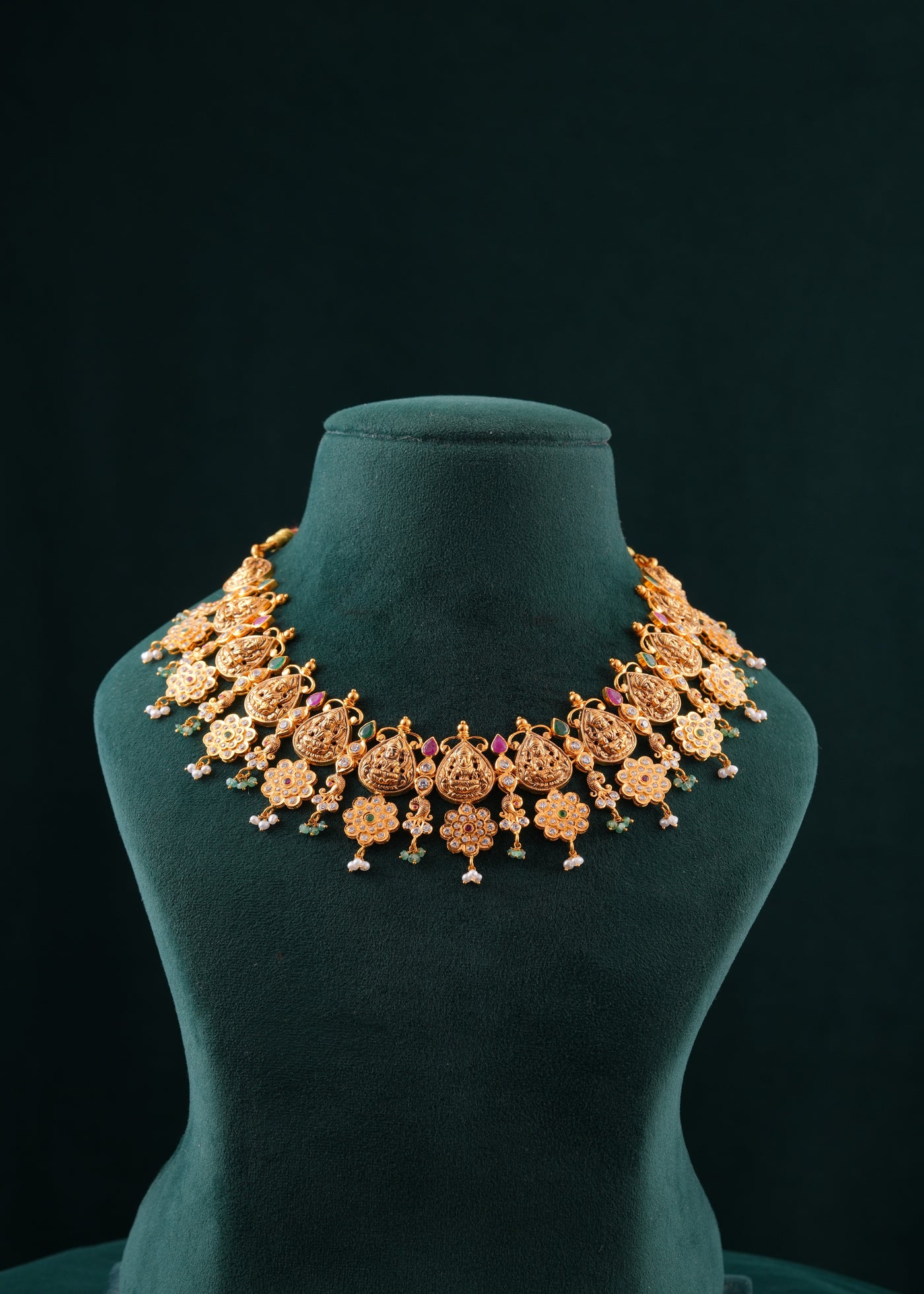 The Lakshmidevi Chowkar is a finely crafted gold ornament symbolizing prosperity and divine blessings. Expertly designed, it features traditional motifs associated with Goddess Lakshmi, making it an auspicious addition to your collection. Its intricate craftsmanship enhances its beauty, suitable for both ceremonial occasions and as a timeless investment piece. This chowkar offers not only elegance but also the cultural significance cherished in Indian heritage.
