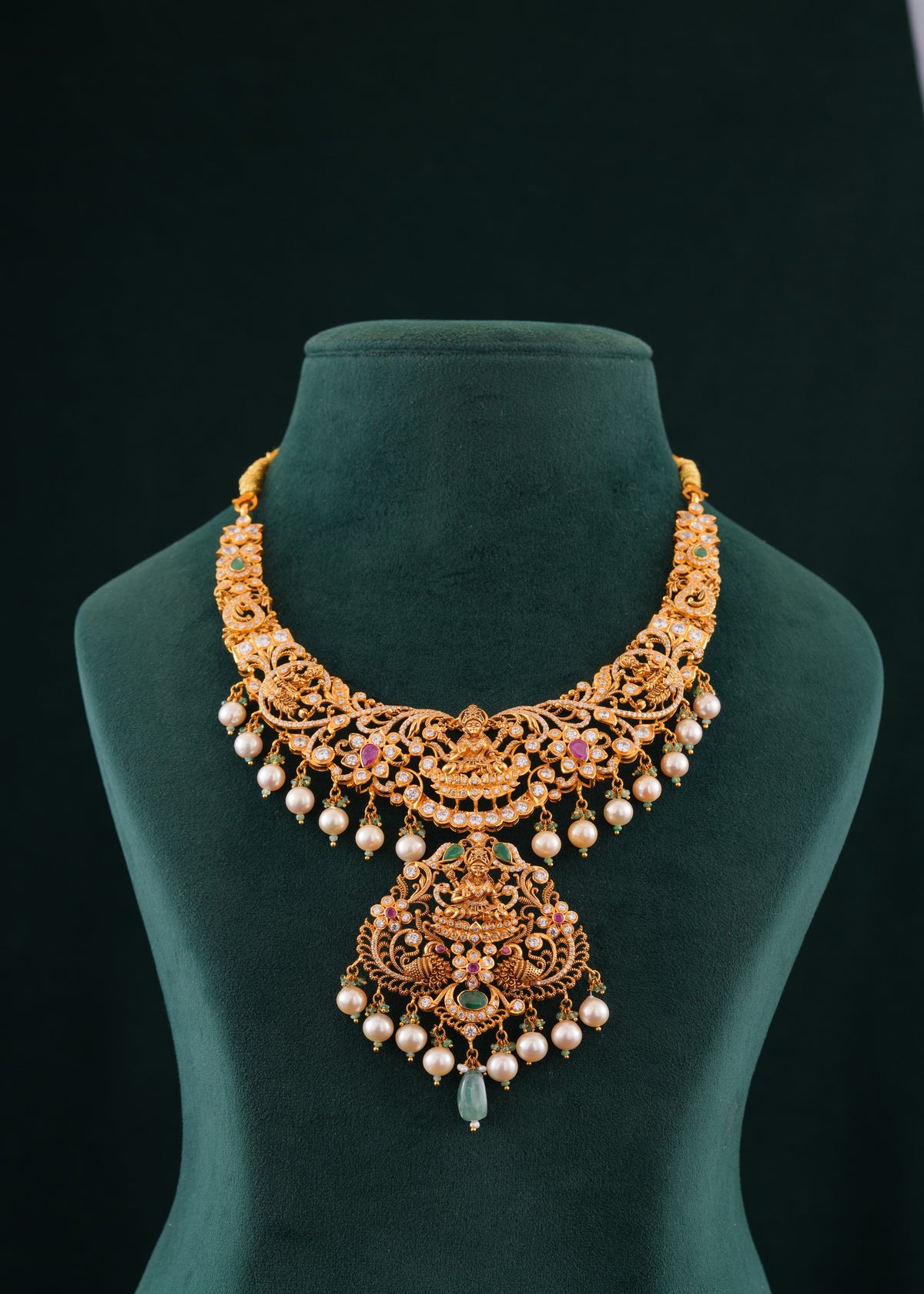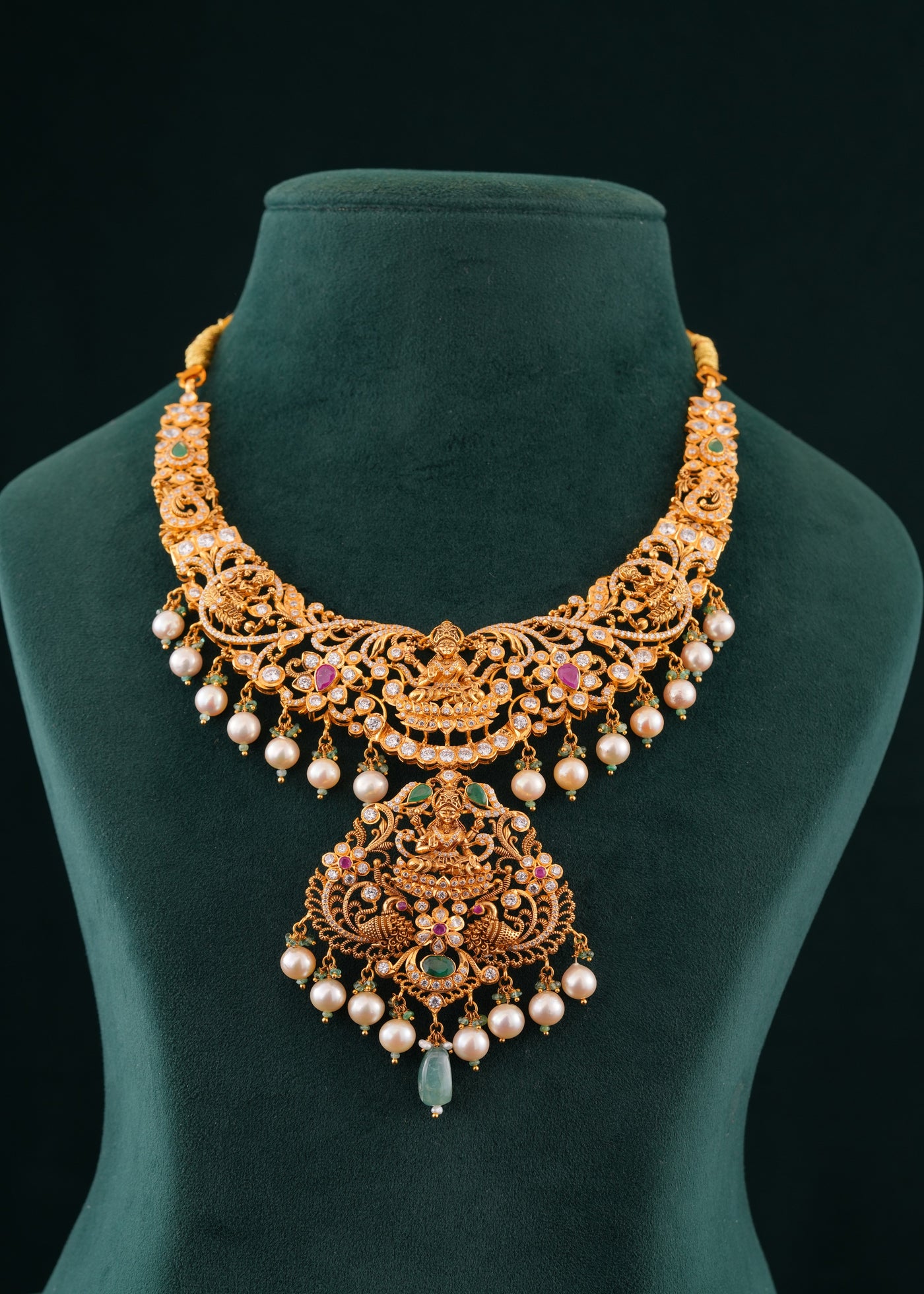 The Lakshmidevi Stones Haram is a meticulously crafted necklace that combines traditional elegance with timeless appeal. Featuring carefully selected stones, this haram reflects expert craftsmanship and cultural heritage, making it an ideal choice for special occasions and celebrations. Its design ensures a regal look, enhancing the wearer’s grace with every adornment. Perfect for those seeking both authenticity and sophistication in their jewelry collection.