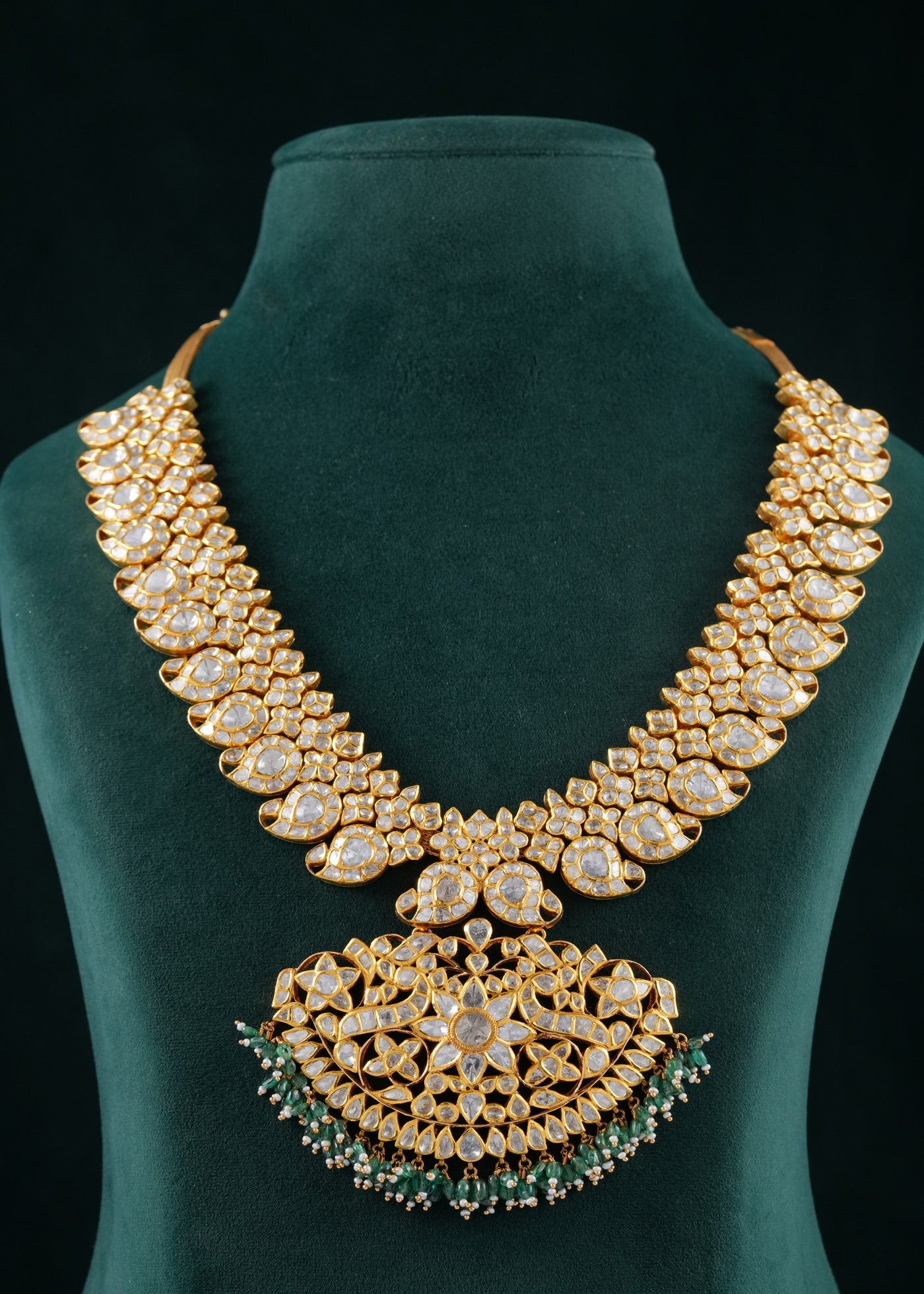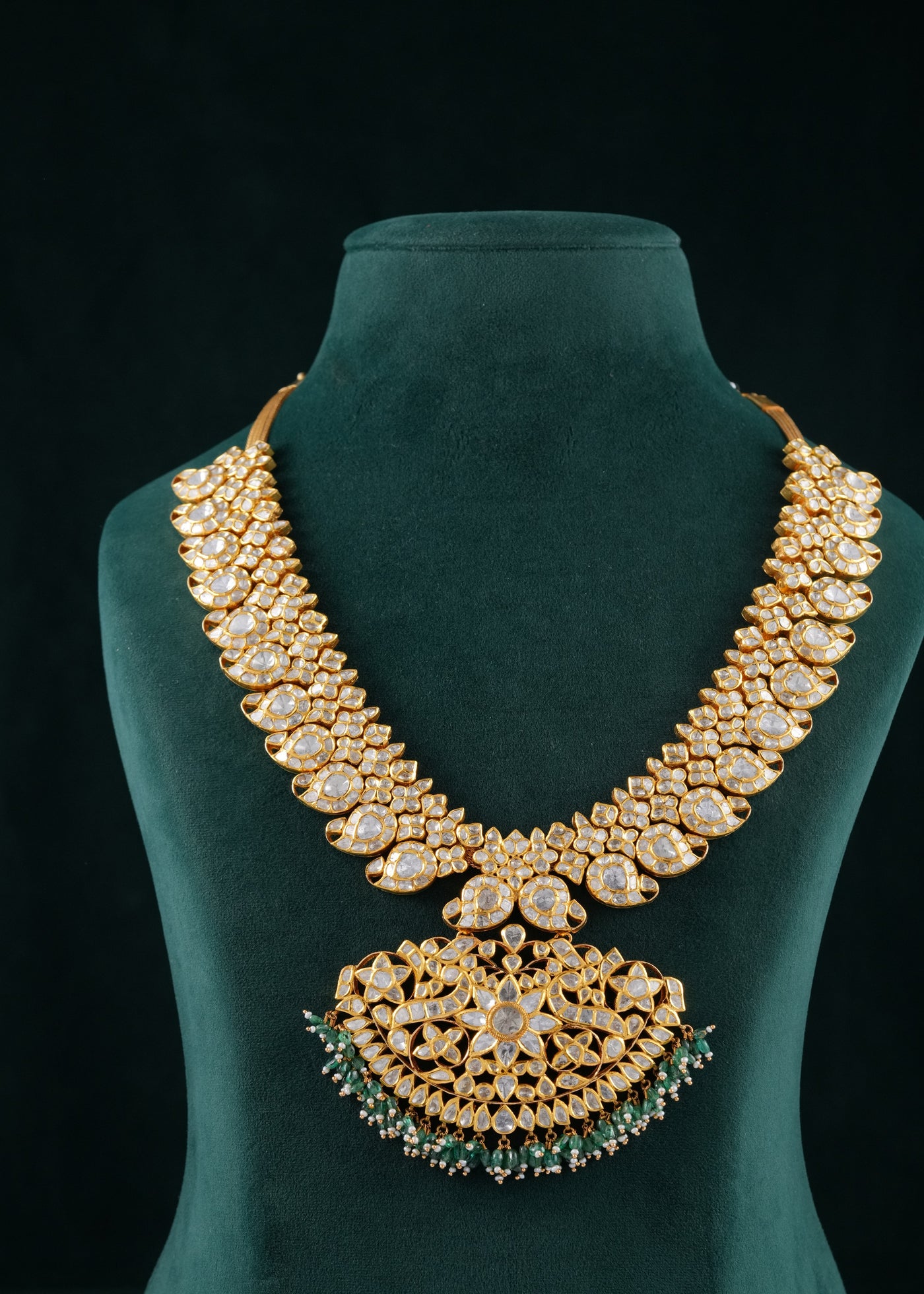 This exquisite gold haram features an elegant mango leaf design intricately crafted to showcase traditional artistry. Adorned with sparkling white stones, it enhances the natural beauty of the motifs, offering a refined balance of classic and contemporary style. Perfect for festive occasions or weddings, this necklace adds a sophisticated touch to any ensemble while reflecting timeless craftsmanship.