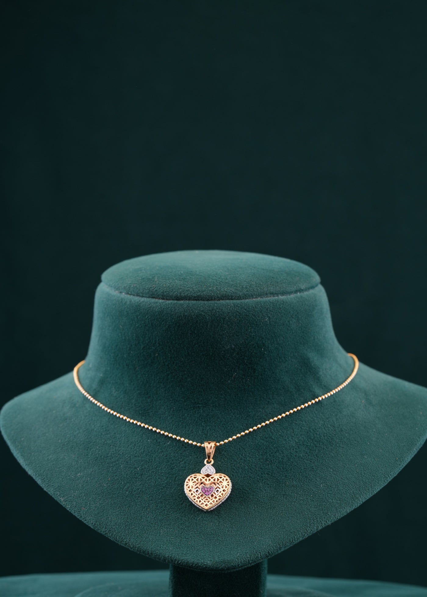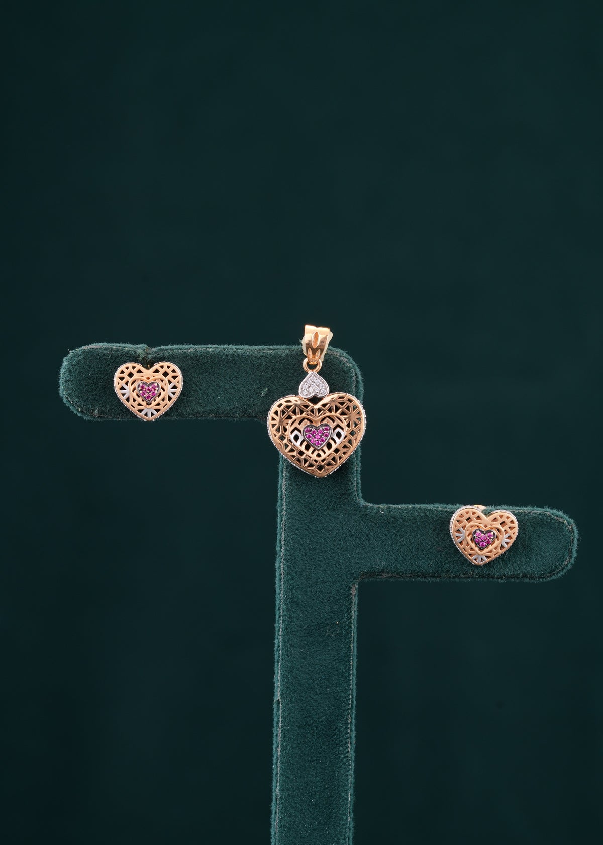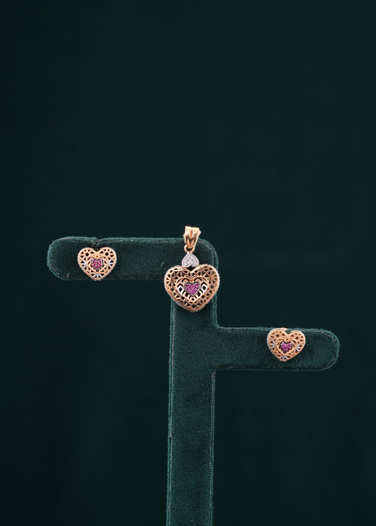 This 18KT pendant set features a sophisticated heart design, expertly crafted to highlight elegance and timeless beauty. Made from high-quality 18-karat gold, it offers lasting shine and durability. Perfect for adding a refined touch to any outfit, this pendant set balances classic charm with modern craftsmanship. Ideal for both daily wear and special occasions, it enhances your jewelry collection with subtle sophistication.