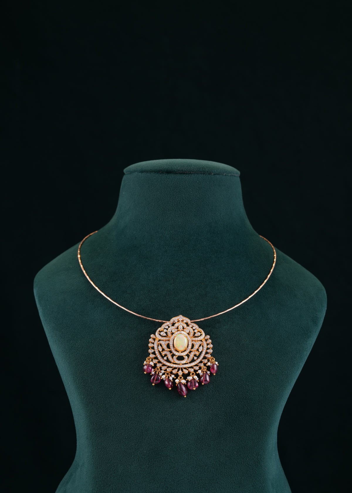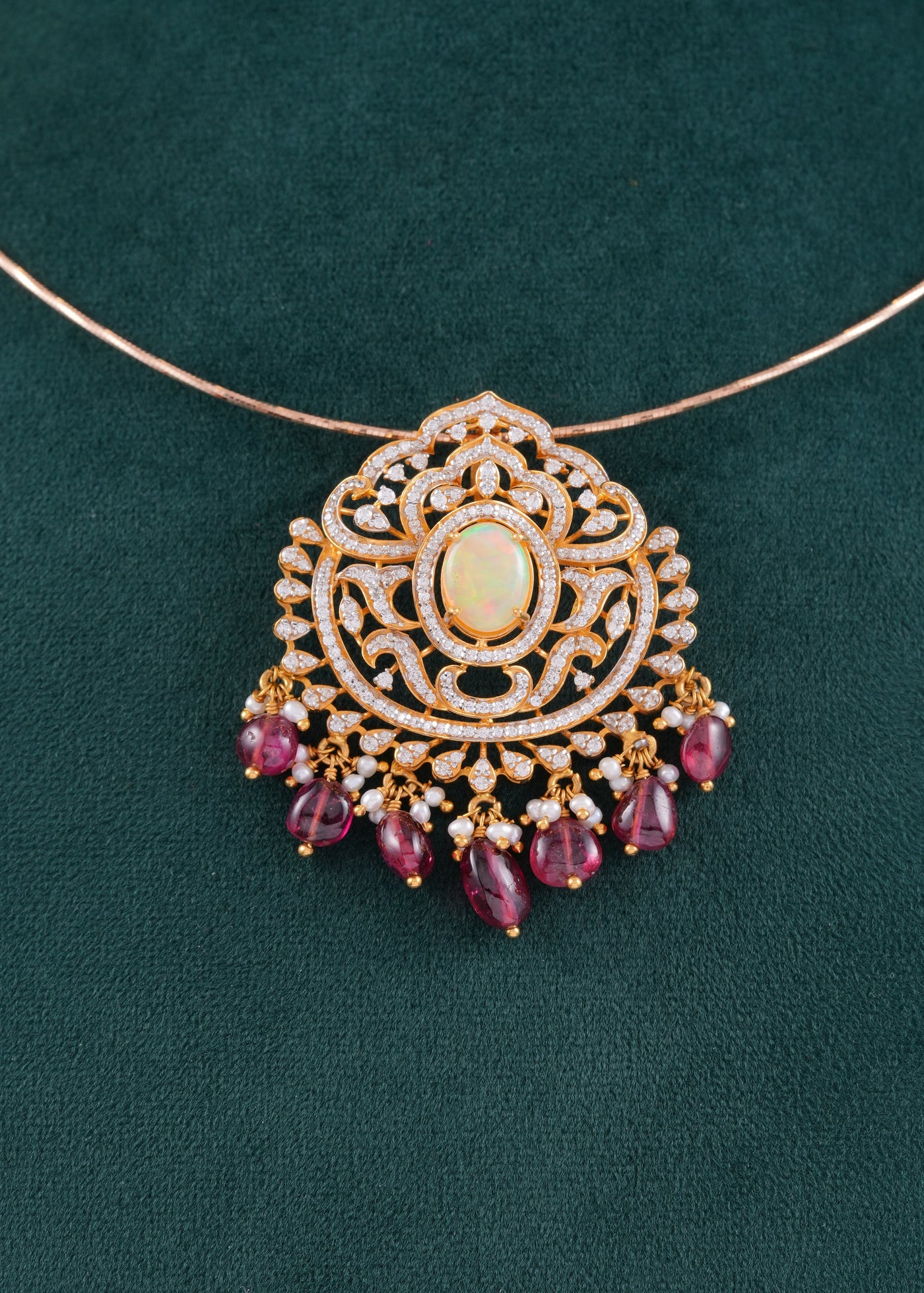 Elevate your jewelry collection with this exquisite 22KT gold pendant, masterfully crafted to showcase the timeless elegance of precious stones. The piece features a harmonious blend of white and pink stones, each carefully selected and set to create a sophisticated aesthetic. The 22-karat gold construction ensures durability and lasting brilliance, while the stone arrangement adds depth and visual interest. Perfect for both everyday wear and special occasions, this pendant complements traditional and contemporary styles alike. An investment piece that reflects refined taste and enduring craftsmanship.