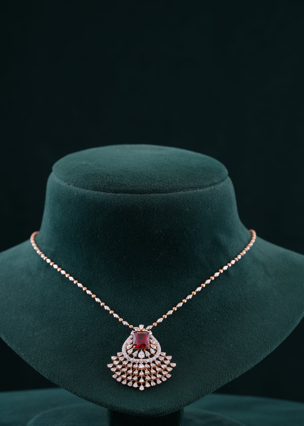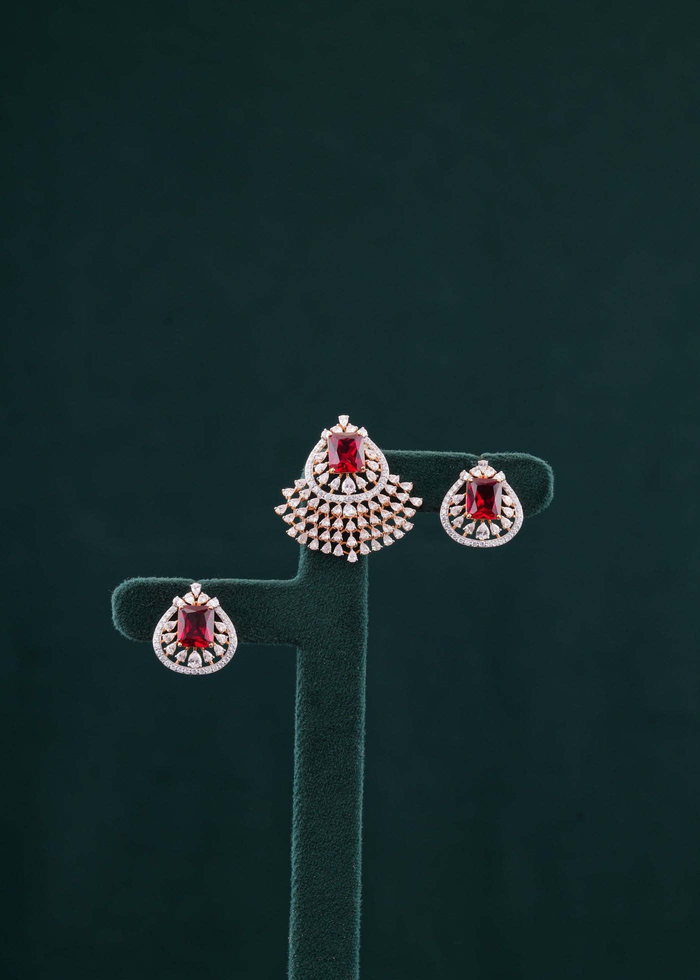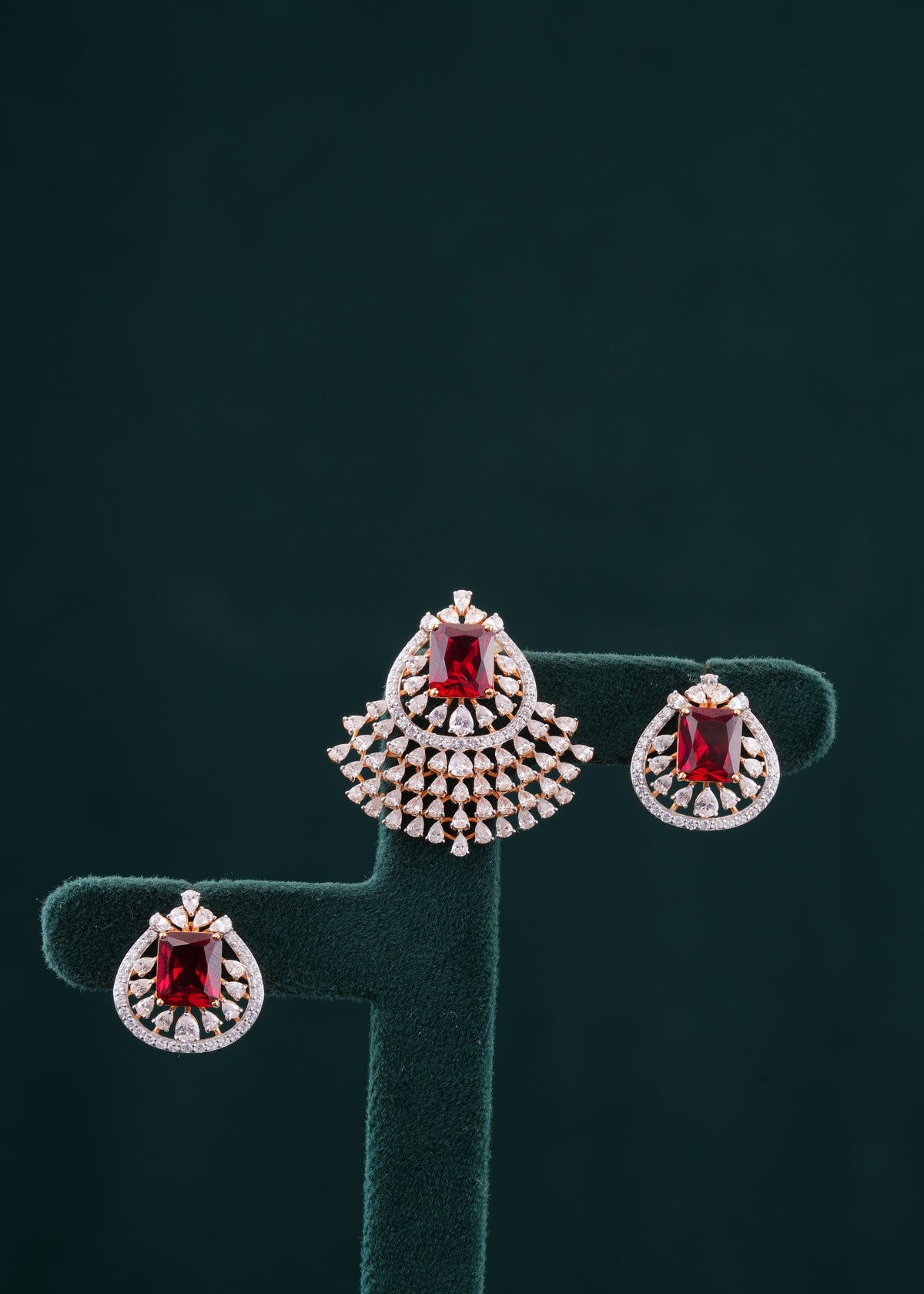 Elevate your elegance with this meticulously crafted pendant set featuring a harmonious blend of white and red stones. Expertly designed to highlight the contrasting sparkle, this set adds a refined touch to any ensemble, perfect for both special occasions and sophisticated everyday wear. The vibrant red stones draw attention, while the white stones enhance brilliance, creating a balanced and timeless accessory that complements your style with expert craftsmanship.