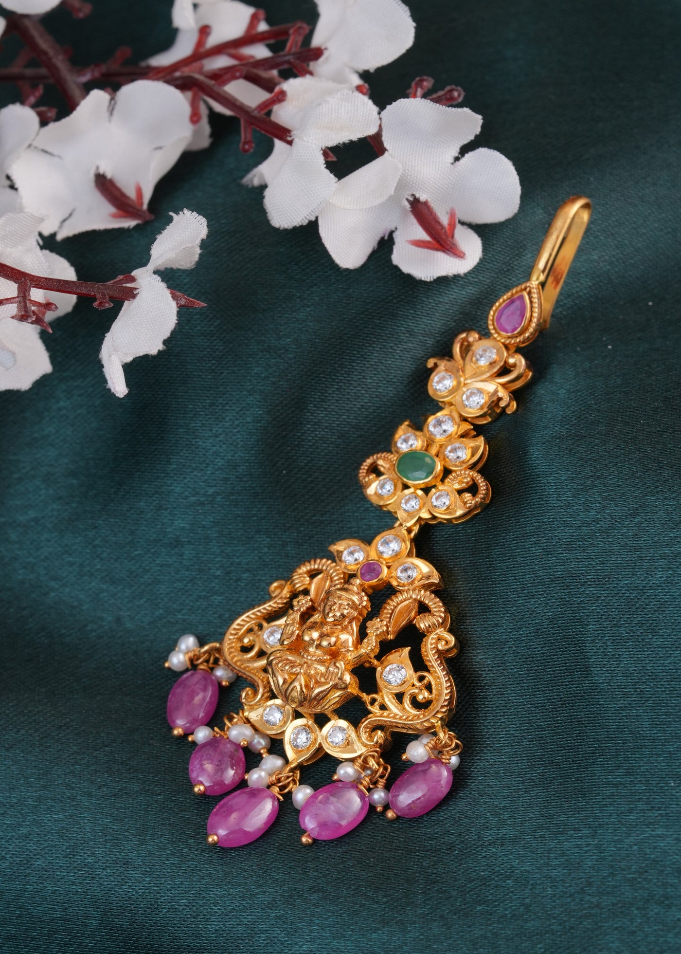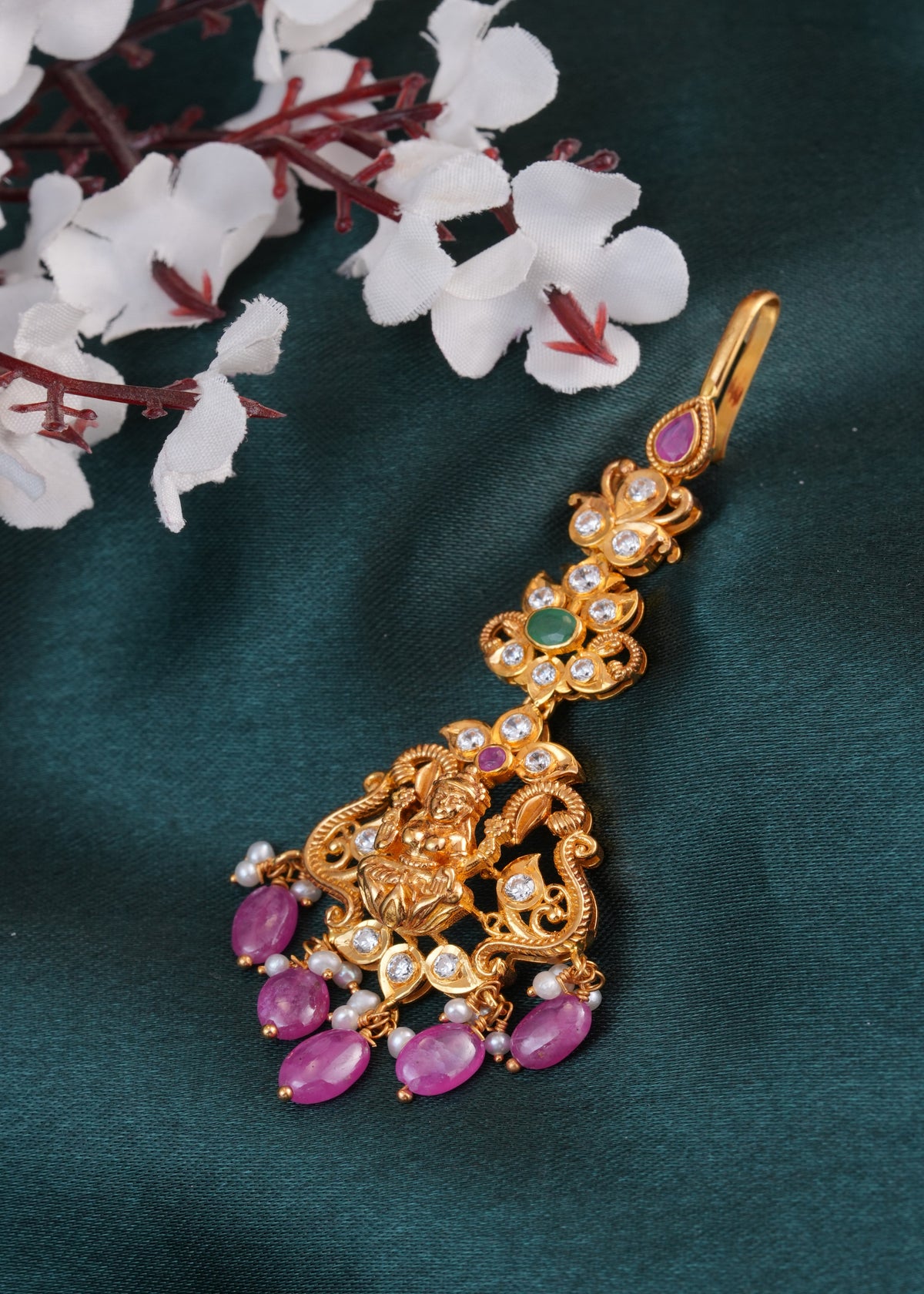 Elevate your bridal ensemble with this exquisite 22KT gold Maang Tikka, adorned with lustrous pink stones that radiate timeless elegance. Meticulously crafted by master artisans, this traditional piece features premium gold purity ensuring durability and lasting brilliance. The carefully selected pink gemstones add a sophisticated pop of color while maintaining the classic aesthetic of this iconic accessory. Perfect for weddings, festivals, and special occasions, this Maang Tikka combines heritage craftsmanship with refined design. An investment piece that transcends trends and becomes a cherished heirloom for generations to come.