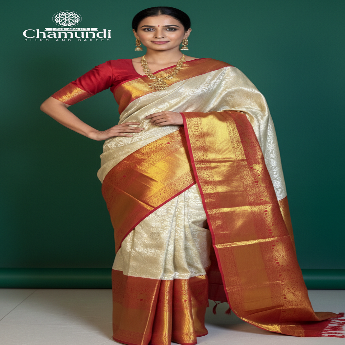 Elevate your ethnic wardrobe with this exquisite Pattu saree, a timeless masterpiece of South Indian weaving tradition. Crafted in luxurious cream silk with a striking red border, this saree combines classic elegance with contemporary appeal. The rich red zari work along the edges adds a touch of opulence and sophistication, making it ideal for weddings, festivals, and special occasions. The smooth, lustrous fabric drapes beautifully, enhancing your natural grace. Perfect for those who appreciate authentic craftsmanship and refined style, this Pattu saree is a versatile investment piece that transcends seasons and trends.