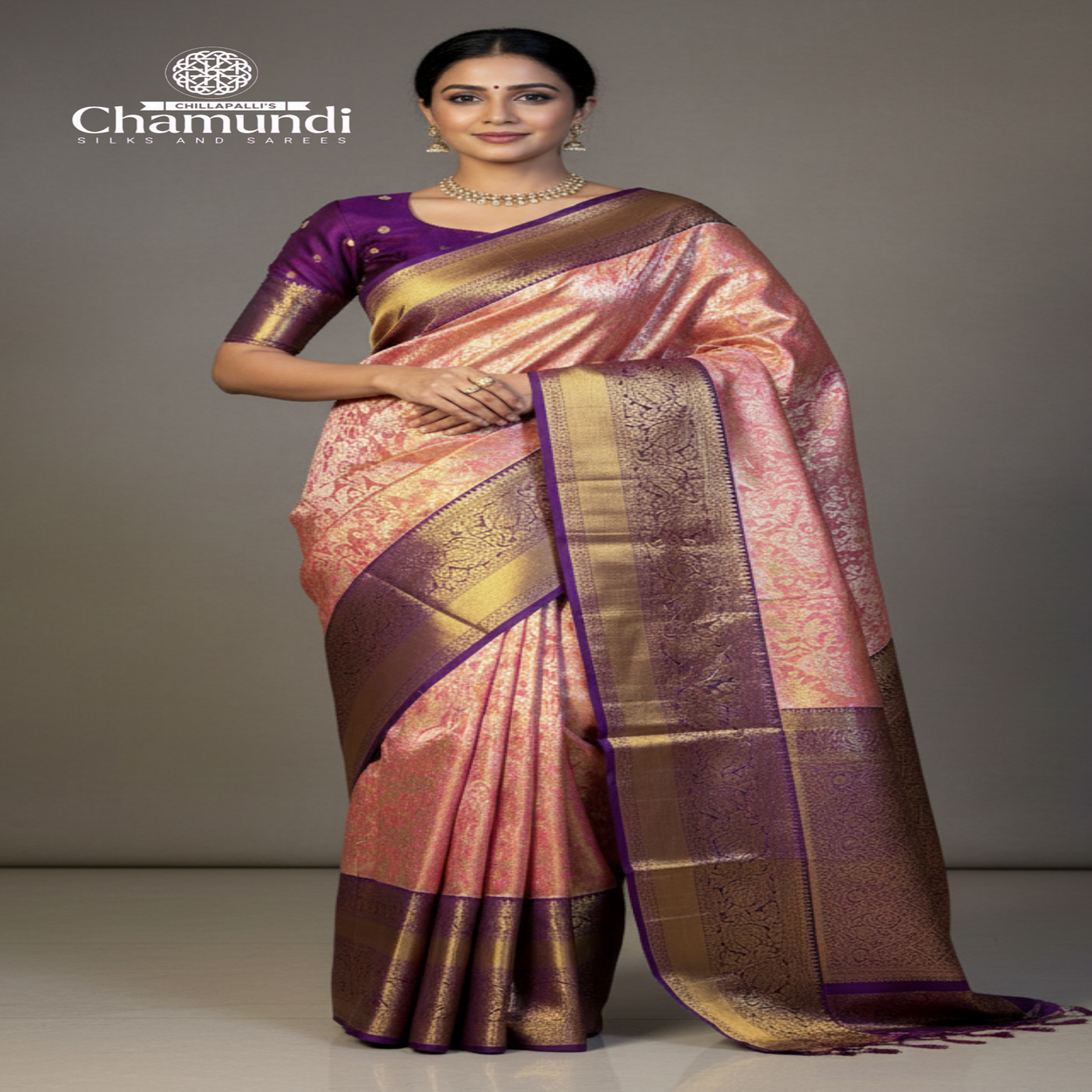 Elevate your ethnic wardrobe with this exquisite Pattu saree, a timeless masterpiece crafted from pure silk. The stunning peach and purple color combination creates a sophisticated contrast that complements all skin tones beautifully. Pattu silk's natural lustre and smooth texture drape elegantly, ensuring you look refined at weddings, festivals, and special occasions. The rich hues and traditional weave reflect authentic South Indian craftsmanship. Perfect for those who appreciate quality silk sarees that blend heritage with contemporary style.